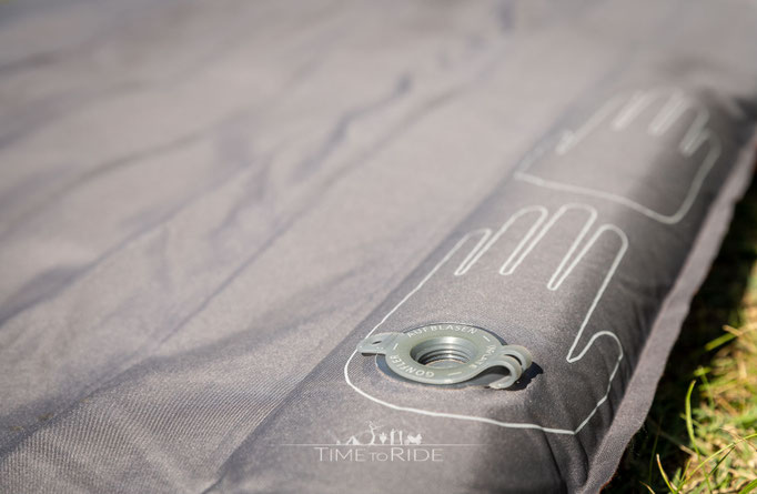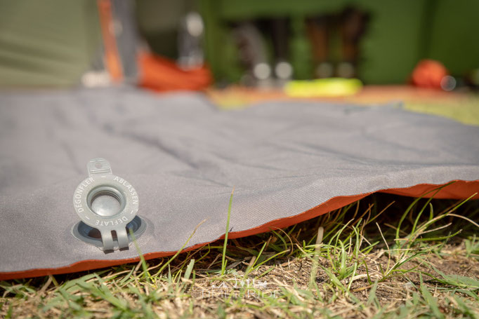 Zum Ablassen gibt es ein zweites Ventil, das einfach geöffnet wird. Danach die Isomatte aufrollen, so wird die gesamte Luft aus der Matte gedrückt und diese kann wieder im Packsack verstaut werden.